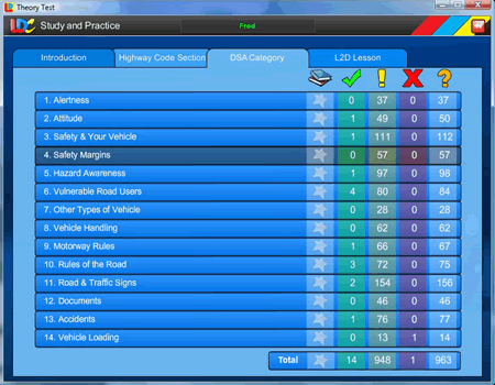 - 14 properly balanced pre-set simulated Theory Tests based on our extensive experience (as one of the largest national driving schools in the UK) of the most commonly occurring test questions all under realistic exam conditions.